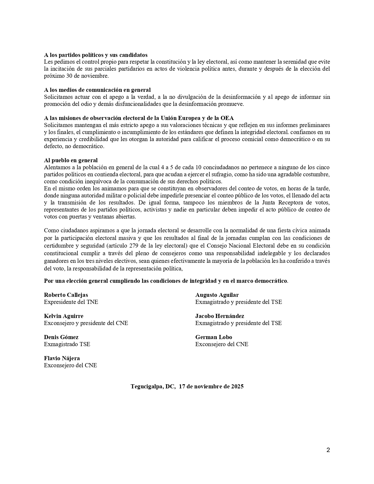 Los exfuncionarios concluyeron exhortando a que la jornada electoral se desarrolle como una verdadera fiesta cívica y que los resultados reflejen, con certeza y seguridad, la voluntad soberana de la mayoría del pueblo hondureño.