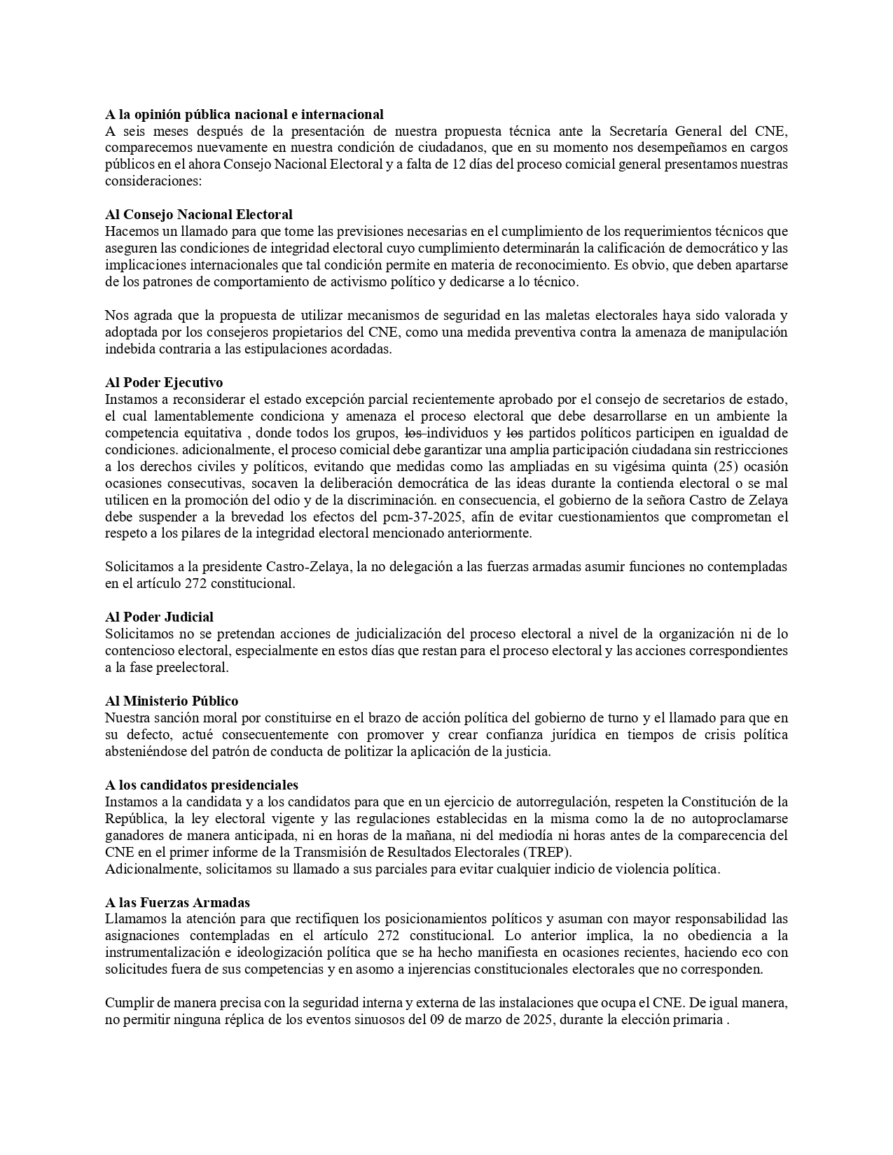Los medios de comunicación también fueron mencionados, con un llamado a informar con veracidad, sin desinformación ni discursos que estimulen odio o polarización. A las misiones de observación de la Unión Europea y la OEA, les solicitaron mantener objetividad y rigor técnico al evaluar el cumplimiento de los estándares internacionales de integridad electoral.