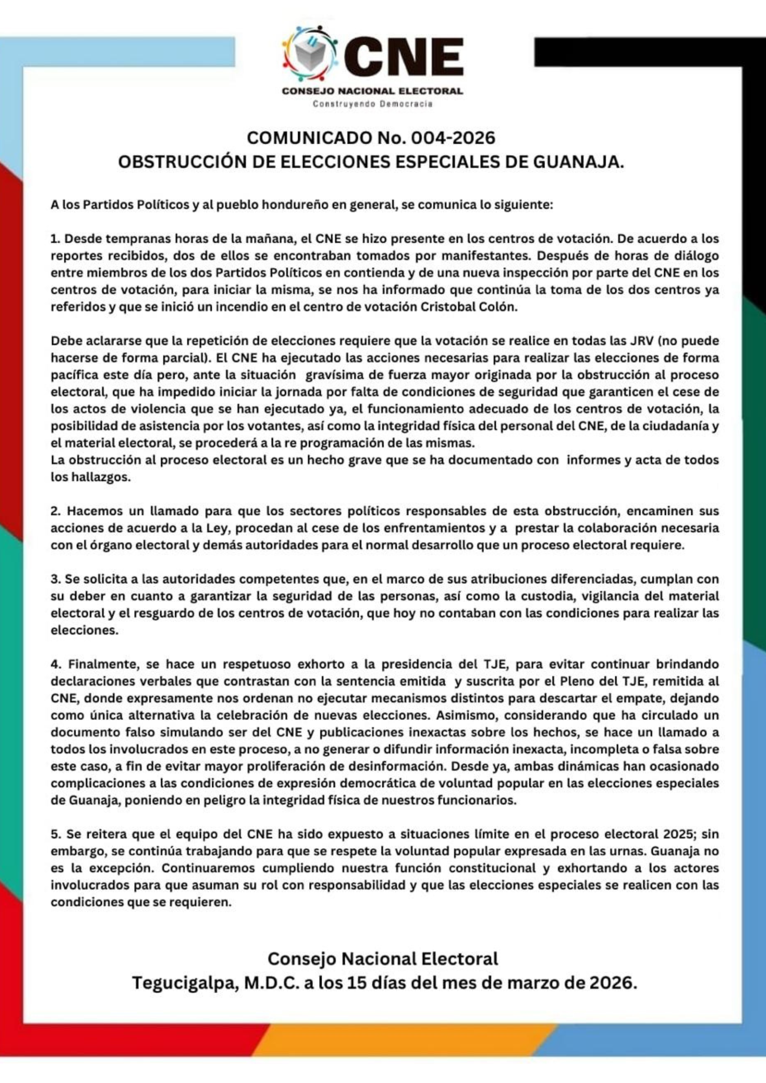 A través del Comunicado No. 004-2026, el órgano electoral informó que desde tempranas horas de la mañana su personal se presentó en los centros de votación para iniciar el proceso; sin embargo, dos de ellos permanecían ocupados por manifestantes.