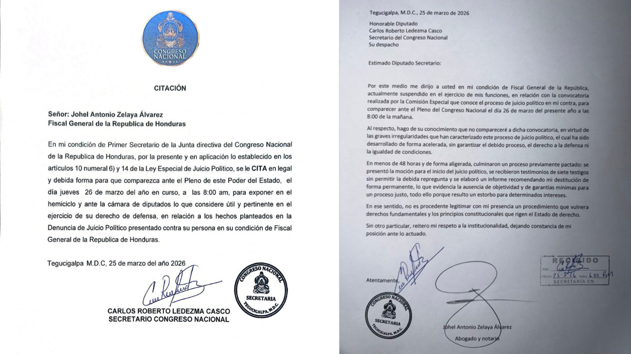 El fiscal general de la República, Johel Antonio Zelaya Álvarez, informó la noche de este miércoles que no asistirá a la comparecencia programada para este jueves 26 de marzo a las 8:00 de la mañana ante el pleno del Congreso Nacional de Honduras, en el marco del juicio político que enfrenta tras ser suspendido de su cargo.