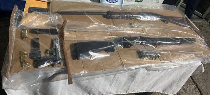 Durante el procedimiento, las autoridades decomisaron dos escopetas calibre 12 milímetros, una pistola calibre 9 milímetros, dos cargadores para arma corta y 20 proyectiles de distintos calibres sin percutir.