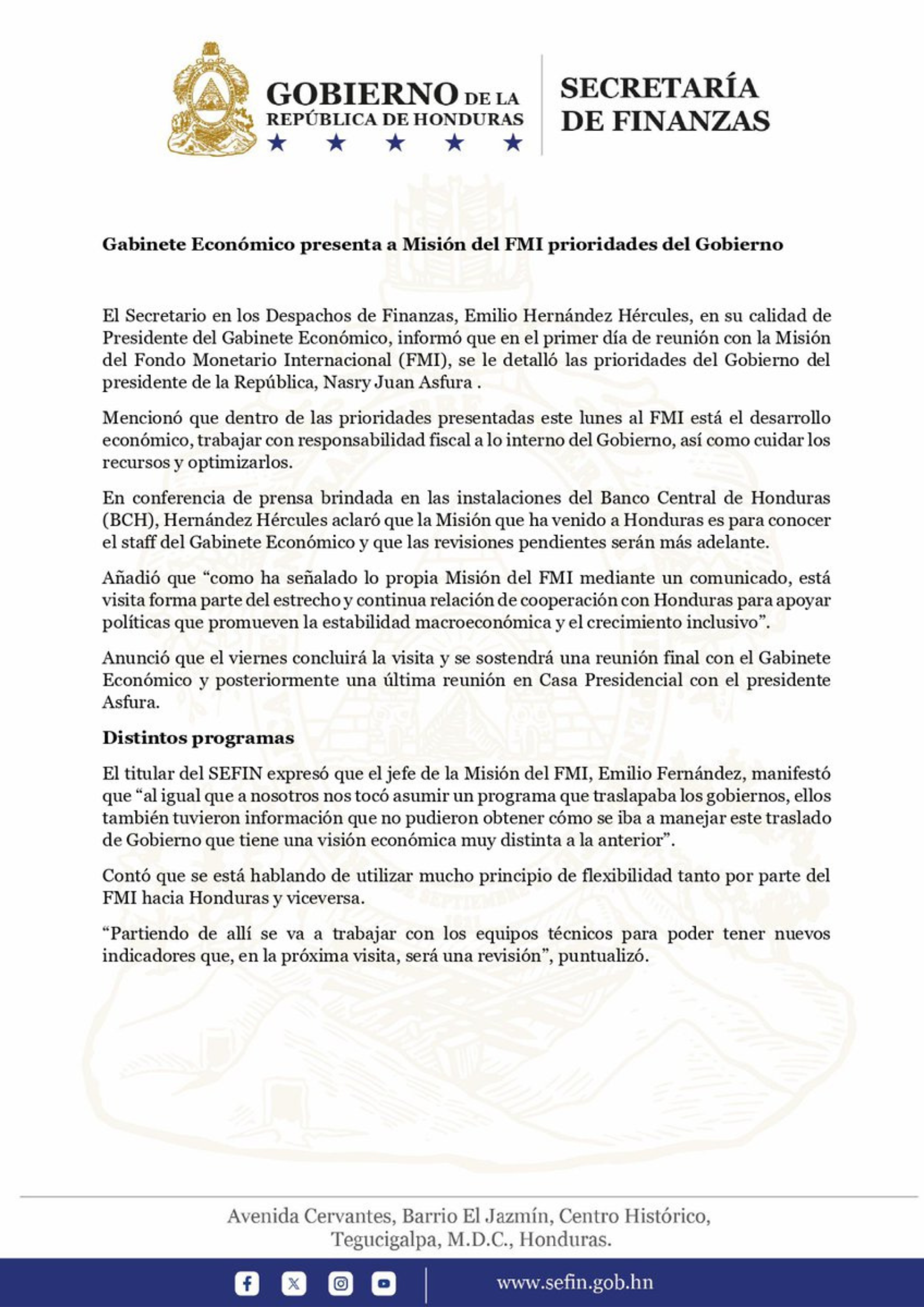 El Emilio Hernández Hércules, titular de la Secretaría de Finanzas y presidente del Gabinete Económico, lideró la reunión inicial con la misión del Fondo Monetario Internacional (FMI) que se encuentra de visita en el país. El encuentro se desarrolló en las instalaciones del Banco Central de Honduras (BCH), en Tegucigalpa.